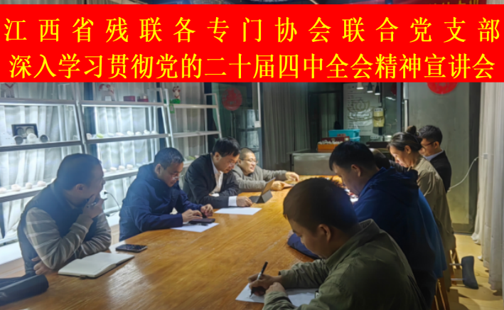 10月8日,江西省残疾人联合会各专门协会联合党支部“深入学习贯彻党的二十届四中全会精神宣讲会”以线上、线下相结合形式在南昌成功举行。江西省残疾人联合会党组成员、副理事长黄建国作宣讲报告。江西省残联组联处处长孙鹏飞、各专门协会联合党支部书记熊俊、各专门协会主席、各专门协会联合党支部党员同志及妇女联合会代表参加会议。