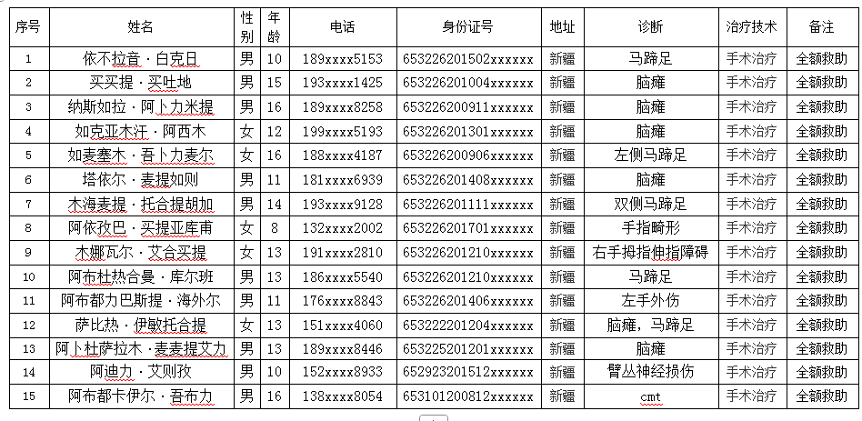 “携手童行---新疆、西藏、青海困境留守儿童骨病肢残人救助项目” 救治对象公示表