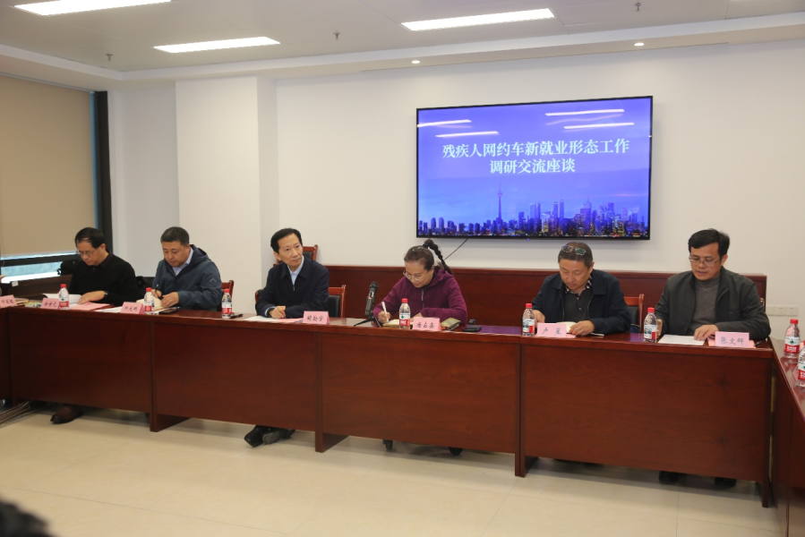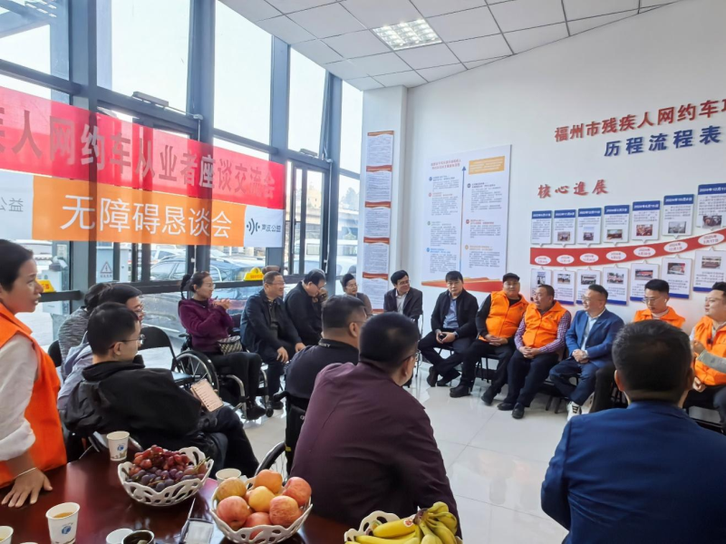 在残疾人网约车司机服务驿站,调研组与网约车司机代表、网约车平台代表等围坐交流,认真倾听各方声音,详细询问残疾人网约车新业态就业路径的探索成效与推进难点。