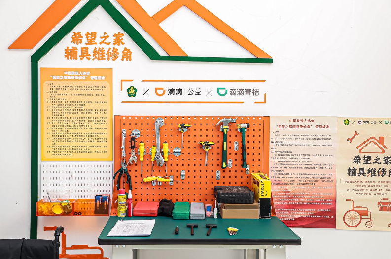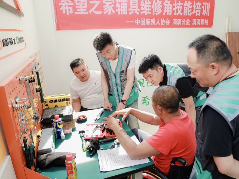 自去年10月起,滴滴公益、滴滴青桔联合中国肢残人协会,在全国设立50个“希望之家-辅具维修角”配置常用工具,满足轮椅维修和保养需求。并陆续在北京、太原、杭州、广州、合肥、呼和浩特等地,面向青桔运维师傅们开展免费培训课程,支持他们掌握轮椅维修和保养的技术。