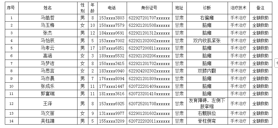 “携手童行---新疆、西藏、青海困境留守儿童骨病肢残人救助项目” 救治对象公示表