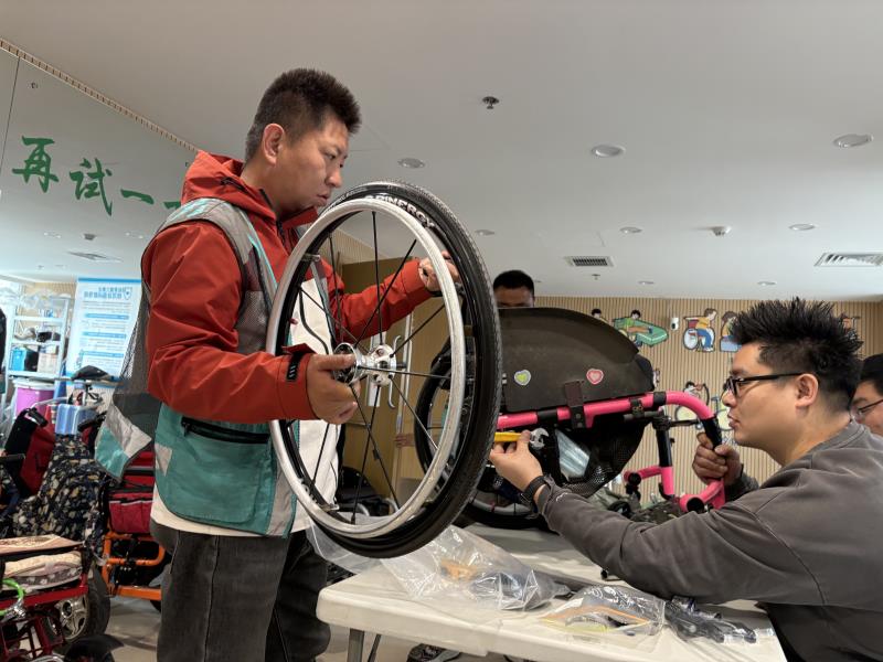 “希望之家辅具维修角” 项目自 2024 年启动以来,已在全国布设 50 个标准化维修服务点位,配齐专业维修工具及常用配件,并常态化开展运维人员轮椅维修技能专项培训,持续为轮椅使用者提供公益维修养护志愿服务。项目有效破解了残疾群众辅具维修难、维修贵、就近修不便的实际困境,让专业运维技能转化为温暖持久的助残公益力量。