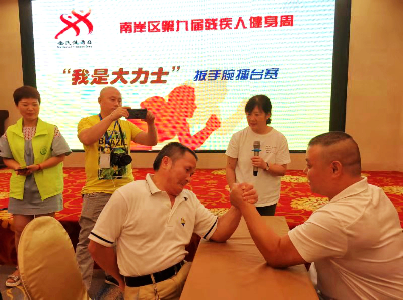 活动中,南岸区第九届残疾人健身周正式宣布启动,并现场举行了“我是大力士” 扳手腕擂台赛。大力士选手们自告奋勇,与去年的冠军进行比拼,紧张又火热,冠军选手最终守擂成功。